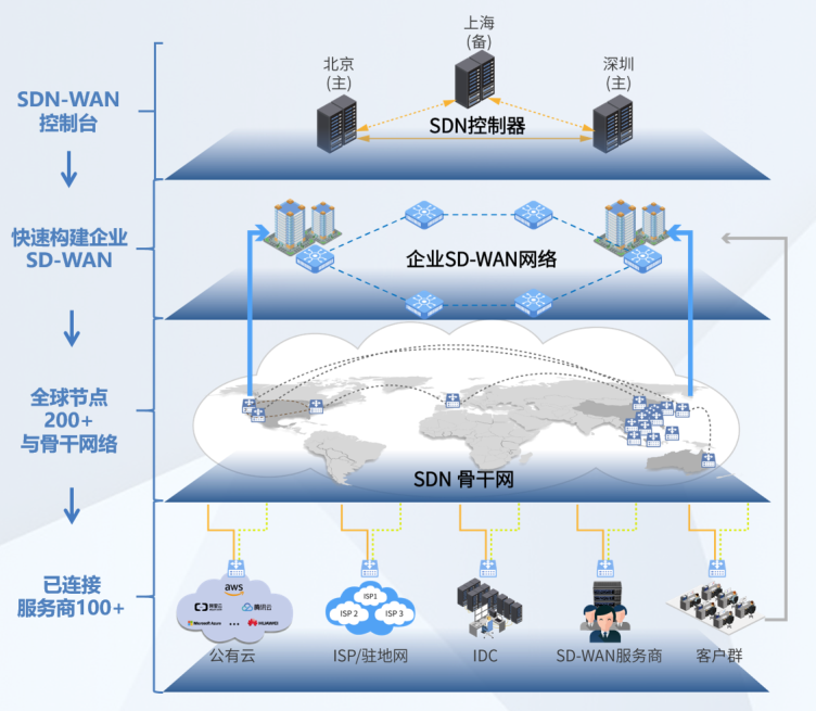 是指將SDN技術(shù)應(yīng)用到廣域網(wǎng)場(chǎng)景中所形成的一種產(chǎn)品或服務(wù)。這種產(chǎn)品或服務(wù)用于連接廣闊地理范圍的企業(yè)網(wǎng)絡(luò)、數(shù)據(jù)中心、互聯(lián)網(wǎng)應(yīng)用及云服務(wù),旨在幫助用戶降低廣域網(wǎng)的開支和提高網(wǎng)絡(luò)連接靈活性。